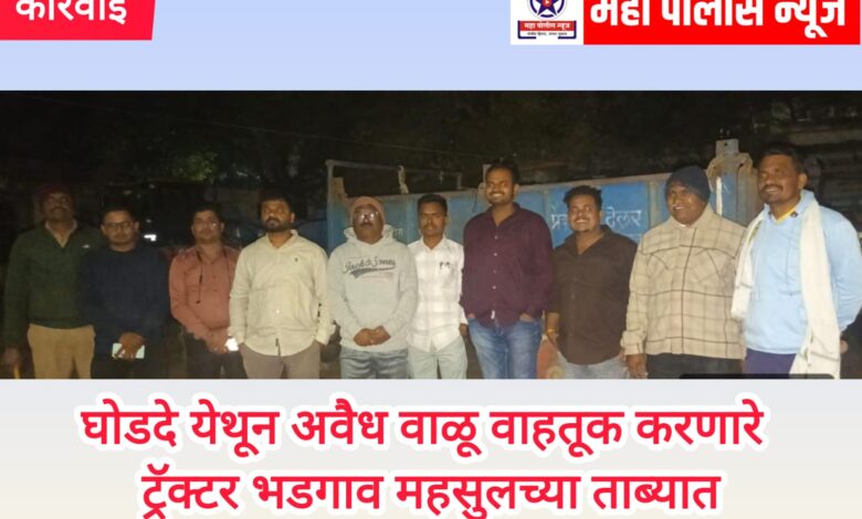भडगाव तहसीलदार शितल सोलाट यांच्या मार्गदर्शनाखाली घोडदे येथून एक ट्रक्टर अवैध गौणखनिज वाहतूक करतांना पकडून तहसिल कार्यालयात जमा केले आहे. नायब तहसीलदार सुधीर सोनवणे ग्राम महसूल अधिकारी अविनाश जंजाळे,प्रविण पवार, संजय सोनवणे,गितेश महाजन,योगेश पाटील,लोकेश महाजन, ग्राम महसूल सेवक नितीन मोरे,समाधान माळी, लहू कोळी आदींच्या पथकाने कारवाई केली आहे.
