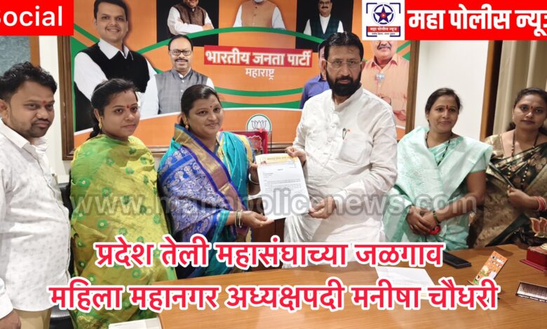 महा पोलीस न्यूज । चेतन वाणी । शहरातील निवृत्ती नगर भागात सामाजिक उपक्रमांमध्ये सातत्याने पुढाकार घेणाऱ्या मनीषा प्रदीप चौधरी यांची प्रदेश तेली महासंघाच्या जळगाव महिला महानगर अध्यक्षपदी निवड करण्यात आली आहे.