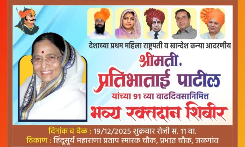 जळगाव : देशाच्या प्रथम महिला राष्ट्रपती व खान्देशच्या कन्या आदरणीय श्रीमती प्रतिभाताई पाटील यांच्या ९१ व्या वाढदिवसानिमित्त तसेच श्री राष्ट्रीय राजपूत करणी सेनाचे राष्ट्रीय अध्यक्ष सुप्रिमो स्व. दादा सुखदेवसिंह गोगामेडी यांच्या द्वितीय पुण्यस्मरण दिनाचे औचित्य साधून भव्य रक्तदान शिबिराचे आयोजन करण्यात आले आहे.हे रक्तदान शिबिर शुक्रवार, दि. १९ डिसेंबर २०२५ रोजी सकाळी ११ वाजता हिंदूसूर्य महाराणा प्रताप स्मारक चौक, प्रभात चौक, जळगाव येथे आयोजित करण्यात आले आहे.