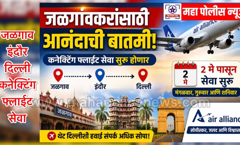 महा पोलीस न्यूज । चेतन वाणी । जळगाव जिल्ह्यातील प्रवाशांसाठी अत्यंत महत्त्वाची आणि दिलासादायक बातमी समोर आली आहे. जळगाव येथून इंदौर मार्गे दिल्ली येथे जाण्यासाठी कनेक्टिंग फ्लाईट सेवा २ मे पासून सुरू होणार आहे.