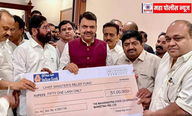 जळगाव प्रतिनिधि राज्यातील अतिवृष्टीग्रस्त शेतकऱ्यांच्या मदतीसाठी सामाजिक बांधिलकी जपत दि महाराष्ट्र स्टेट को-ऑपरेटिव्ह मार्केटिंग फेडरेशन लिमिटेड, महाराष्ट्र राज्य, मुंबई यांच्या वतीने मुख्यमंत्री सहाय्यता निधीमध्ये तब्बल ₹51,00,000 (एकावन्न लाख रुपये) इतक्या देणगीचा धनादेश मुख्यमंत्री देवेंद्र फडणवीस यांना मुंबई येथे सुपूर्त करण्यात आला.