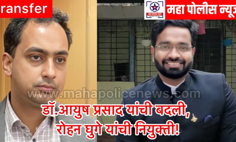 महा पोलीस न्यूज । चेतन वाणी । महाराष्ट्र शासनाच्या सामान्य प्रशासन विभागातून आज एक मोठी प्रशासकीय फेरबदलाची घोषणा करण्यात आली आहे. जळगाव जिल्ह्यात सुमारे दोन वर्षांपासून जबाबदारी सांभाळणारे जिल्हाधिकारी आयुष प्रसाद यांची बदली करण्यात आली असून, त्यांच्या जागी ठाणे जिल्हा परिषदेचे मुख्य कार्यकारी अधिकारी (सीईओ) रोहन घुगे यांची जिल्हाधिकारी म्हणून नियुक्ती करण्यात आली आहे. ही बदली अपर मुख्य सचिव (सेवा) व्ही. राधा यांच्या निर्देशानुसार आणि शासनाच्या बदली प्रक्रियेचा भाग म्हणून पार पडली आहे. डॉ.आयुष प्रसाद यांची बदली नाशिक जिल्हाधिकारी म्हणून करण्यात आली आहे.