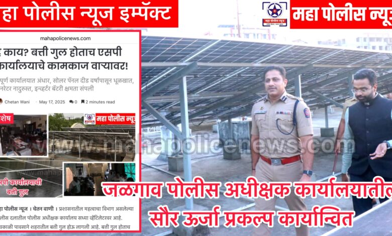महा पोलीस न्यूज । चेतन वाणी । पर्यावरणाचे रक्षण आणि वीज बचतीचा संदेश देत जळगाव पोलीस अधीक्षक कार्यालयाने सौर ऊर्जेकडे पाऊल टाकले आहे. पोलीस अधीक्षक डॉ.महेश्वर रेड्डी यांच्या प्रयत्नाने कार्यान्वित करण्यात आलेल्या १०० किलोवॉट क्षमतेच्या सौर ऊर्जा प्रकल्पाचे उद्घाटन जिल्हाधिकारी रोहन घुगे यांच्या हस्ते नुकतेच पार पडले. पोलीस अधीक्षक कार्यालयावर दिड वर्षापासून सोलर पॅनल धुळखात असल्याचे वृत्त मे महिन्यात महा पोलीस न्यूजने प्रसिद्ध केले होते. त्यानंतर या प्रकल्पाला गती मिळाली आणि गुरुवारी तो कार्यान्वित करण्यात आला.