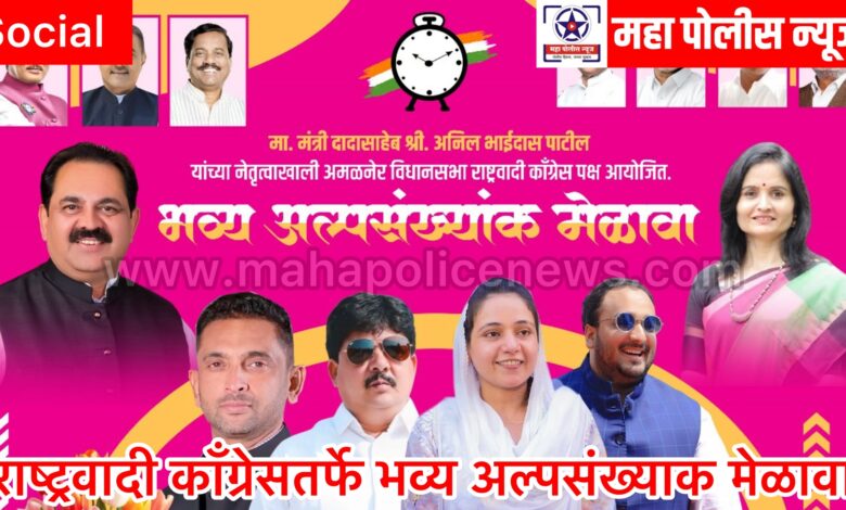 महा पोलीस न्यूज । पंकज शेटे । राष्ट्रवादी काँग्रेस पक्षाच्यावतीने अमळनेर शहरात आज, शुक्रवार ७ नोव्हेंबर रोजी भव्य अल्पसंख्याक मेळाव्याचे आयोजन करण्यात आले आहे. हा मेळावा छत्रपती शिवाजी महाराज नाट्यगृहात दुपारी साडेतीन वाजता पार पडणार असून, माजी मंत्री आणि आमदार अनिल भाईदास पाटील यांच्या अध्यक्षतेखाली कार्यक्रमाचे आयोजन केले आहे.
