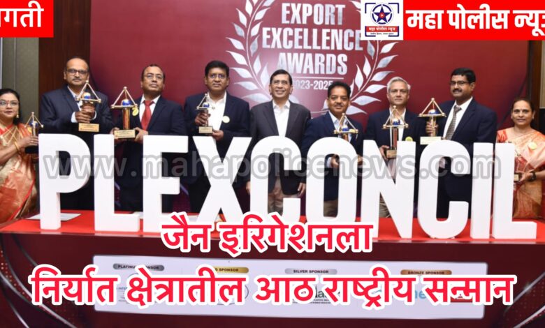 महा पोलीस न्यूज । चेतन वाणी । कृषीक्षेत्रासाठी पाईप, ठिबक सिंचन प्रणाली, पीव्हीसी शीट्स व होजेस यांचे उत्पादन करणाऱ्या जैन इरिगेशन सिस्टिम्स लिमिटेड या आघाडीच्या कंपनीने पुन्हा एकदा निर्यात क्षेत्रात आपली दमदार कामगिरी सिद्ध केली आहे. प्लास्टिक एक्सपोर्ट प्रमोशन कौन्सिल (प्लेक्स कौन्सिल)तर्फे २०२३-२४ आणि २०२४-२५ या दोन वर्षांसाठी जाहीर करण्यात आलेल्या पुरस्कारांमध्ये कंपनीने तब्बल आठ पारितोषिके पटकावली.
